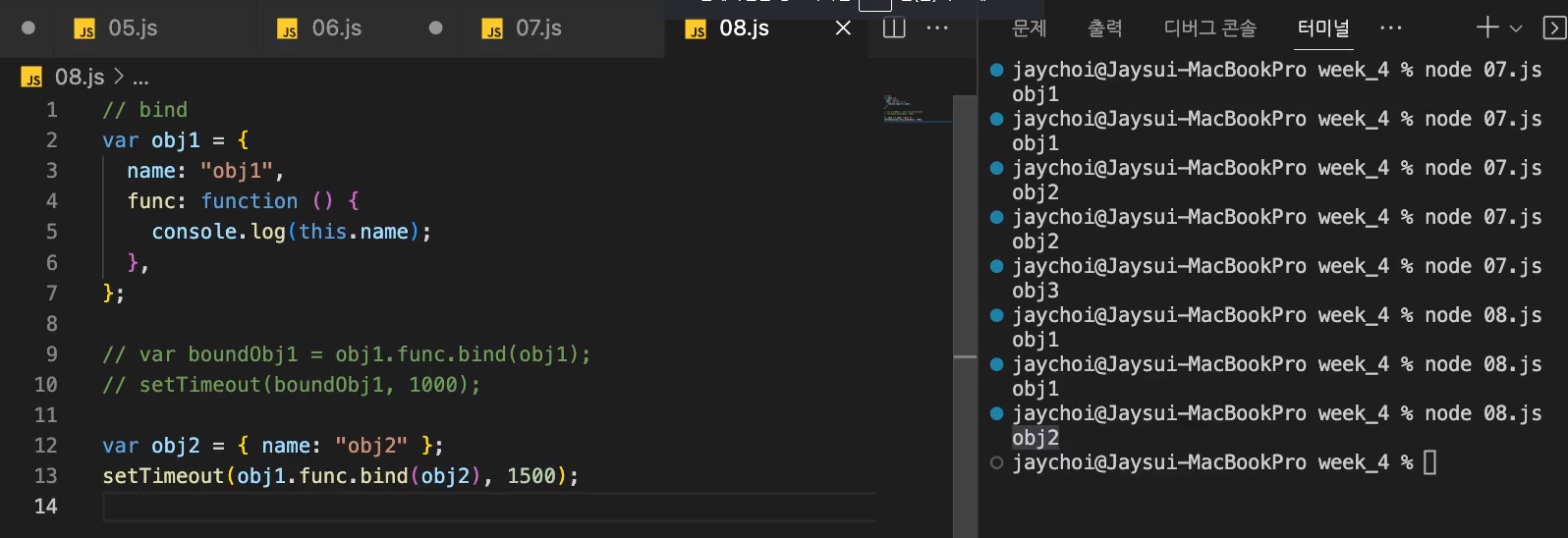 //obj1.func๋ฅผ ์คํํ ๋ ๋ฌด์กฐ๊ฑด this๋ obj1๋ก ๊ณ ์ ํด์ค!