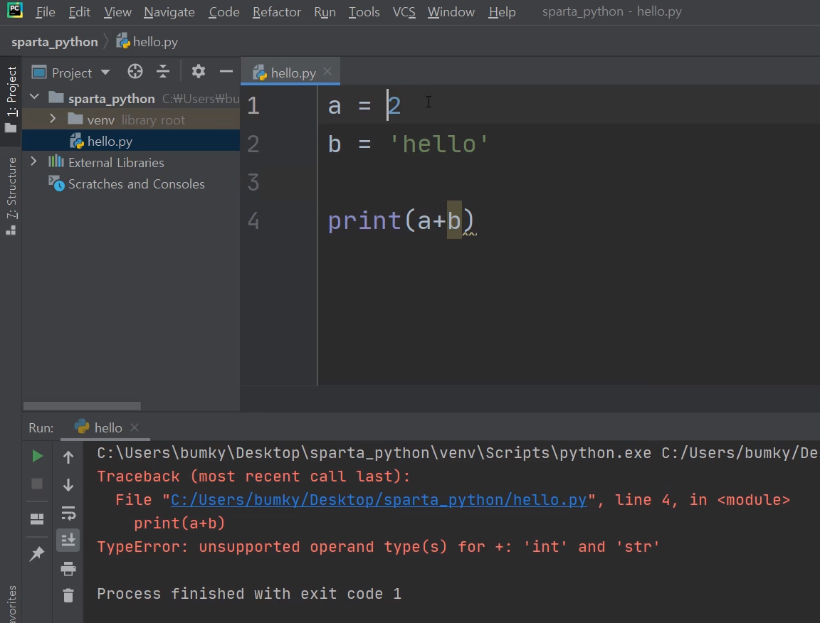 a + 5 # 문자열과 숫자형은 더할 수 없어서 에러!