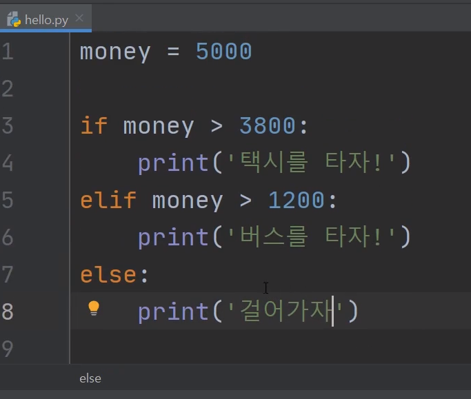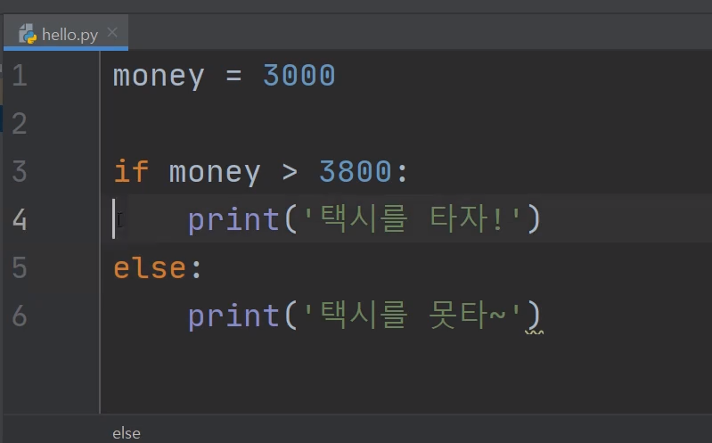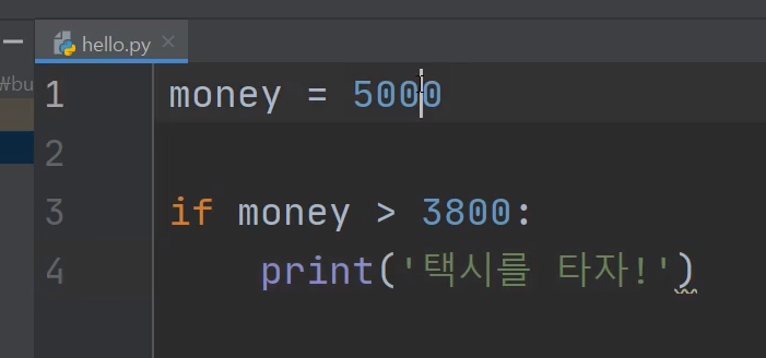 - 조건에는 불 자료형이 들어간다. money > 3800은 True
