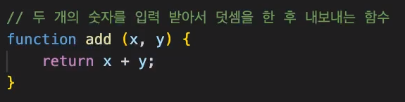 function 키워드를 사용하여 add라는 함수를 선언한다. 함수 선언문을 사용하면 함수를 미리 정의해두고, 필요할 때 호출할 수 있다.